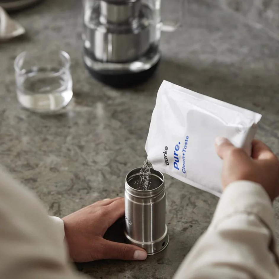 De Pure filterkorrels maken je water zachter, schoner en smaakvoller door kalkaanslag, chloor en zware metalen te verminderen. De korrels in het zakje zijn exclusief gemaakt voor de Aarke Purifier-technologie en worden in het hervulbare waterfilterpatroon van de Purifier gegoten. De korrels worden verkocht in sets van 3 navulzakken. Eén zak filtert tot 120 liter water. Vervang de filterkorrels om de vier weken. Geniet van puur water met de Pure filterkorrels!